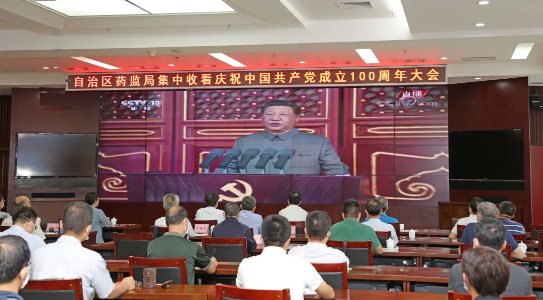 7月1日上午,庆祝中国共产党成立100周年大会在北京天安门广场隆重举行。中共中央总书记、国家主席、中央军委主席习近平发表重要讲话。自治区药监局组织党员干部职工集中收看直播盛况,共庆中国共产党百年华诞。